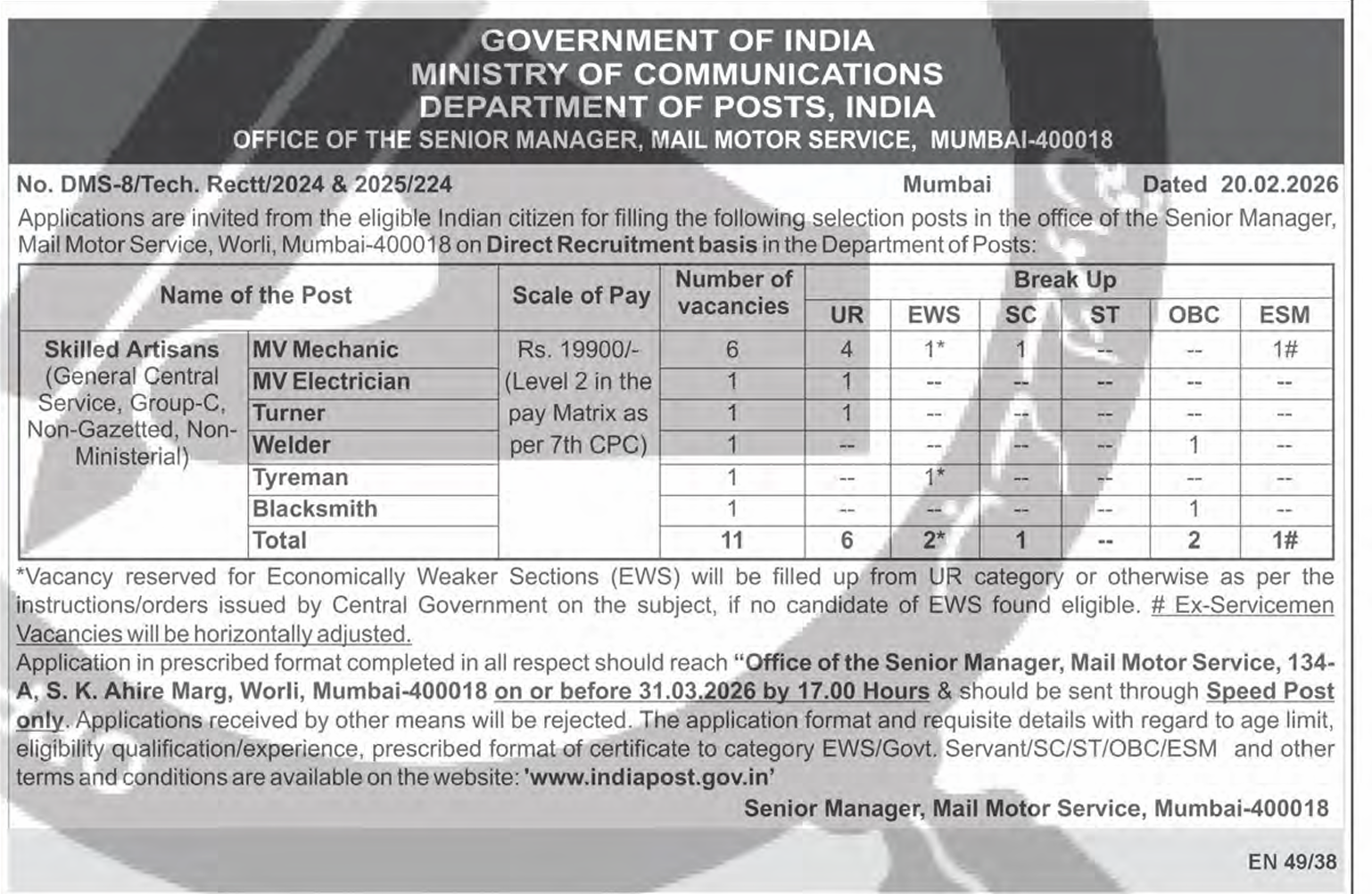 India Post is the backbone of the country’s communication network, operating with a vast fleet of vehicles to ensure timely delivery of mail and parcels. Its Mail Motor Service (MMS) units are responsible for the transportation of this mail. This recruitment is for filling crucial technical posts in the MMS unit at Worli, Mumbai. Skilled Artisans will be responsible for the maintenance, repair, and overhauling of the postal department’s vehicles, ensuring its fleet remains in top condition.
