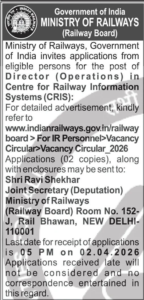 - Visit Official Website: Go to the Indian Railways website at www.indianrailways.gov.in. Navigate to the section “For IR Personnel” and then to “Vacancy Circular” to find the detailed advertisement titled “Vacancy Circular_2026” for the post of Director (Operations) in CRIS.