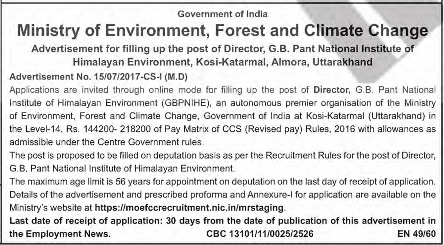 | Post Name | Director, G.B. Pant National Institute of Himalayan Environment (GBPNIHE) |